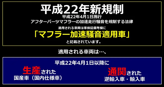 純正マフラーから社外マフラーに交換し、車検を継続させるには、【マフラー加速騒音適応マフラー】を取付る必要が御座います。